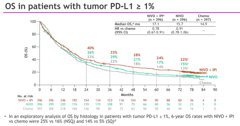 CheckMate-227(6年随访):PD-L1 ≥ 1%人群OS