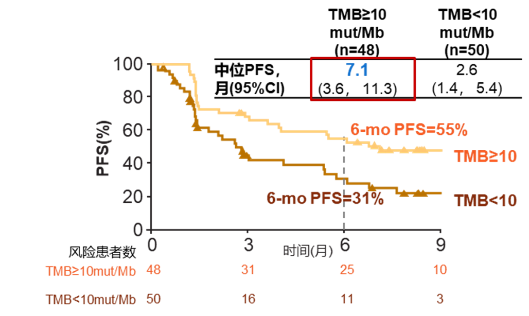 其次,II期CheckMate-568研究显示,O+Y在PD-L1 ≥ 1%与 ≥ 50%的NSCLC一线人群中PFS近似(6个月PFS率分别为52%和54%) [4] , 而按 TMB 状态分层后差异明显: TMB ≥ 10 mut/Mb人群的6个月PFS率达55%,<10 mut/Mb人群为31% [5] 。