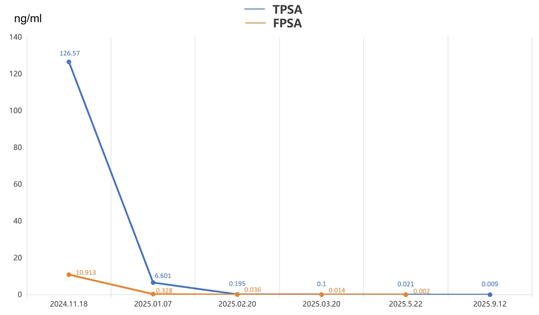 随访检查结果示,睾酮水平显著降低(2025.3.20),PSA显著下降,未出现潮红、发热等不良反应,未出现注射部位不良反应,骨痛症状有明显缓解。目前继续应用该方案,无明显不适。