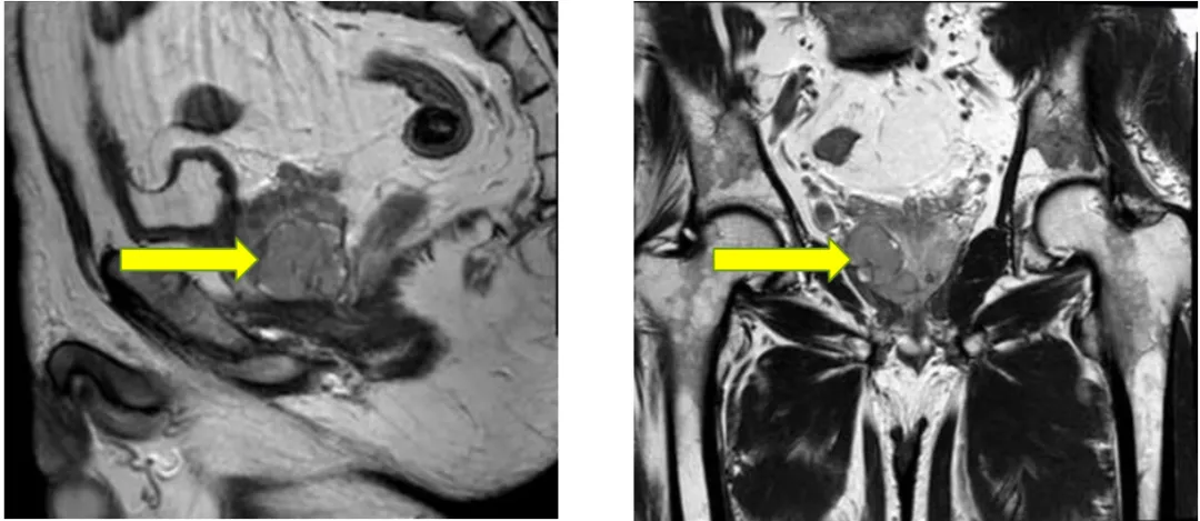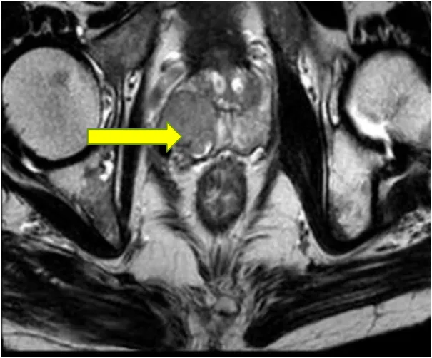 前列腺大小约为4.9cm×4.9cm×3.5cm,形态异常,右侧包膜欠光整,右侧周围带见团块状异常信号灶,T2WI等低信号,T1WI低信号,DWI明显增高,边界欠清,长径约为3.9cm,与右侧肛提肌分界不清,略受推挤向外侧移位。