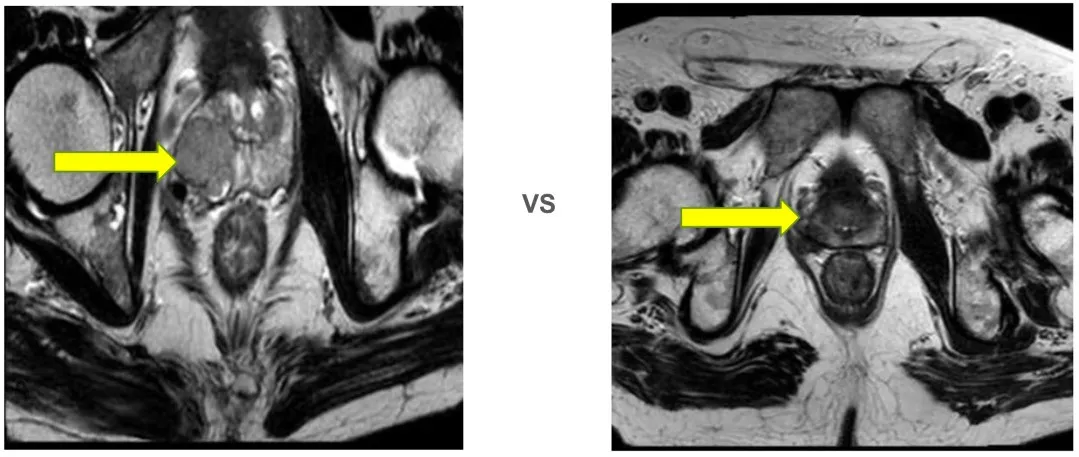 1. 考虑前列腺右侧周围带肿瘤,与右侧肛提肌分界欠清。