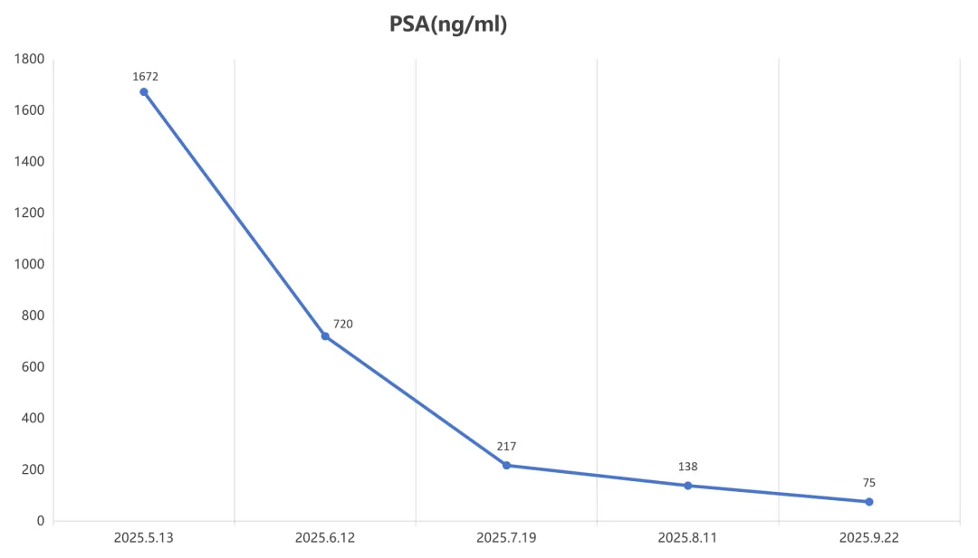 自2025年7月3日-2025年9月26日,随访检查结果示,睾酮水平显著降低,PSA显著下降,未出现潮红、发热等不良反应,腰背部、下肢疼痛症状缓解,化疗期间恶心呕吐明显,对症治疗后可缓解。