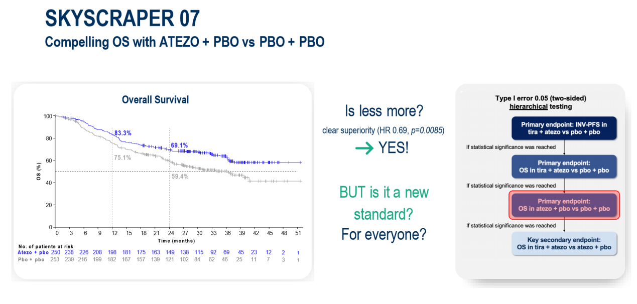 SKYSCRAPER-07采用了分层统计设计,若主要终点(Tiragolumab + 阿替利珠单抗 vs. 安慰剂)为阴性,则后续所有终点仅作为描述性和探索性分析。结果显示,该研究的首要研究终点(PFS)未达到,研究被定义为阴性。双免联合组对比安慰剂组的OS也同样没有显著改善。
