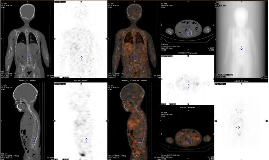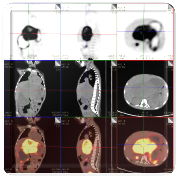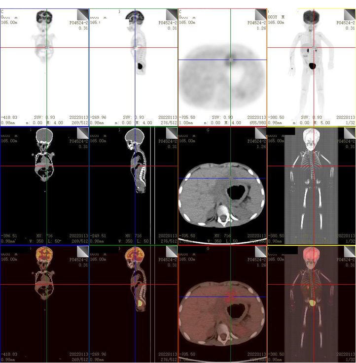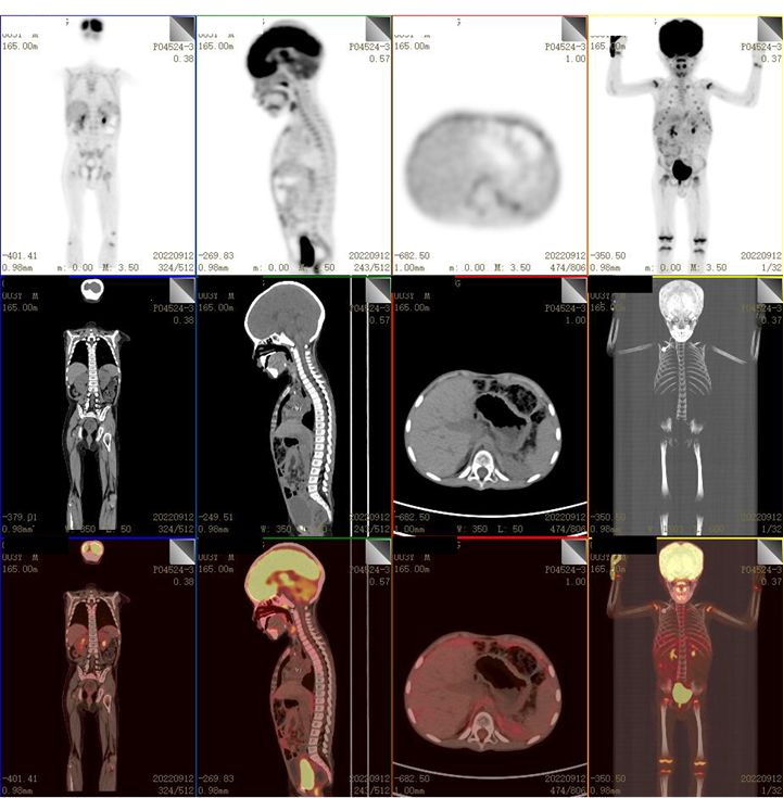 中上腹腔见多发不规则巨大囊实性占位(最大层面约14.7cm × 12.2cm × 13.7cm),实性区代谢增高,考虑恶性肿瘤,以NB可能大。左侧膈上、肌脚后间隙、右肾门区及腹膜多发高代谢肿大淋巴结及软组织包块,考虑转移。