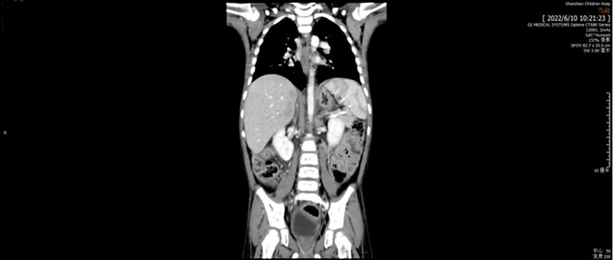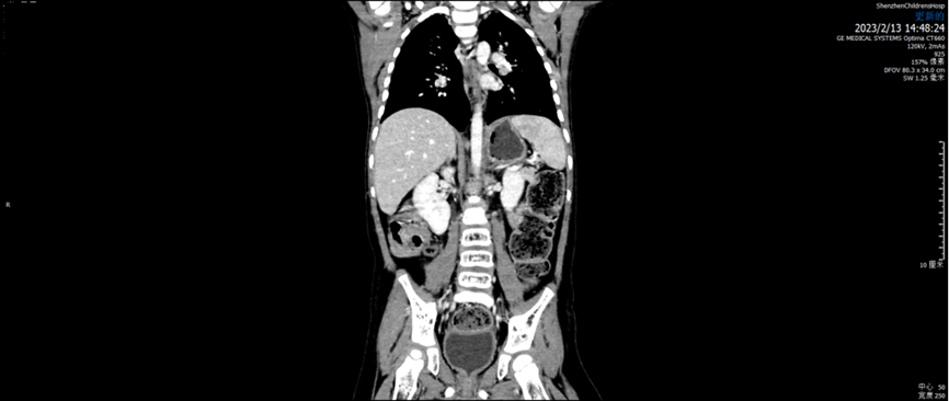现病史:2021年8月8日,家长无意中发现患儿腹部包块,无发热、腹痛、呕吐、腹泻等伴随症状。查体:Wt 12.7kg,Ht 92cm,发现上腹部可触及10cm×8cm大小的包块,质地韧,边界不清,无触痛。