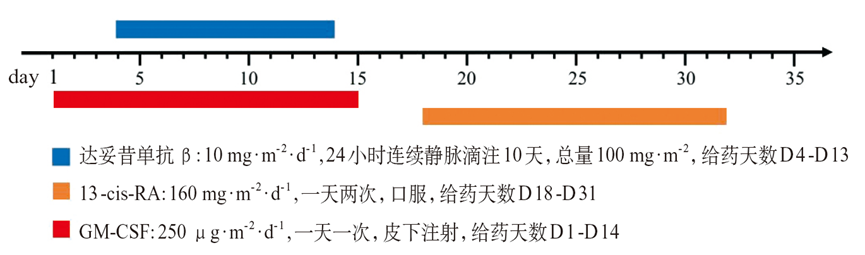 达妥昔单抗β:10mg/m²/d,24小时连续静脉滴注10天,总量100mg/m²,d4-d13。