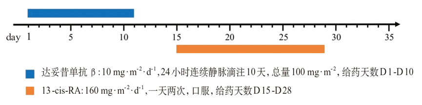 达妥昔单抗β:10mg/m²/d,24小时连续静脉滴注10天,总量100mg/m²,d1-d10。