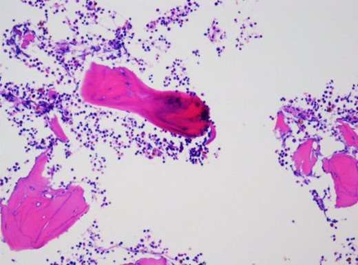 骨髓涂片:(右髂后)骨髓增生活跃,全片见大量转移肿瘤细胞团。