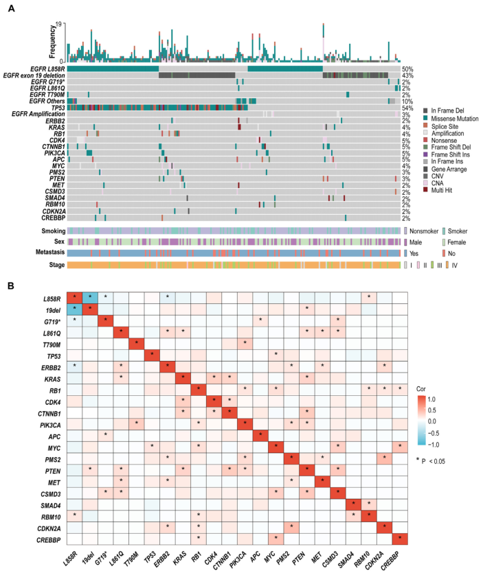 图1 EGFR突变NSCLC患者的基因组改变及其相关性。(A)EGFR突变NSCLC患者(n=240)基因改变及临床病理信息的肿瘤图谱瀑布图。(B)各种基因组改变的相关性。
