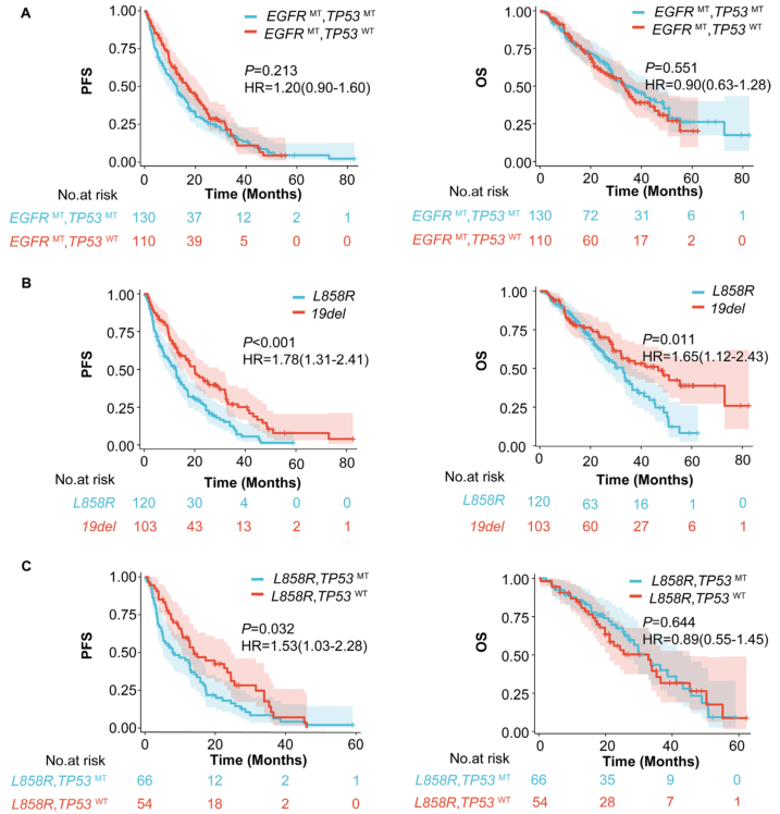 图2 TP53突变(MT)或TP53野生型(WT)的EGFR突变患者的PFS和OS的Kaplan-Meier曲线。(A)EGFR突变/TP53突变与EGFR突变/TP53野生型之间的PFS和OS;(B)EGFR L858R突变患者与EGFR 19del患者的PFS和OS;(C)EGFR L858R突变/TP53突变患者与EGFR L858R突变/TP53野生型患者的PFS和OS。