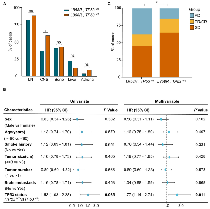 图3 EGFR-TKIs疗效的临床预测因素。(A)EGFR L858R/TP53突变型(MT)组与EGFR L858R/TP53野生型(WT)组之间受累器官部位的不同模式;(B)接受EGFR TKIs治疗的EGFR L858R/TP53突变型患者中,与PFS相关的临床特征的单变量和多变量分析;(C)EGFR L858R/TP53突变型患者与EGFR L858R/TP53野生型患者对EGFR TKIs的影像学应答分布。