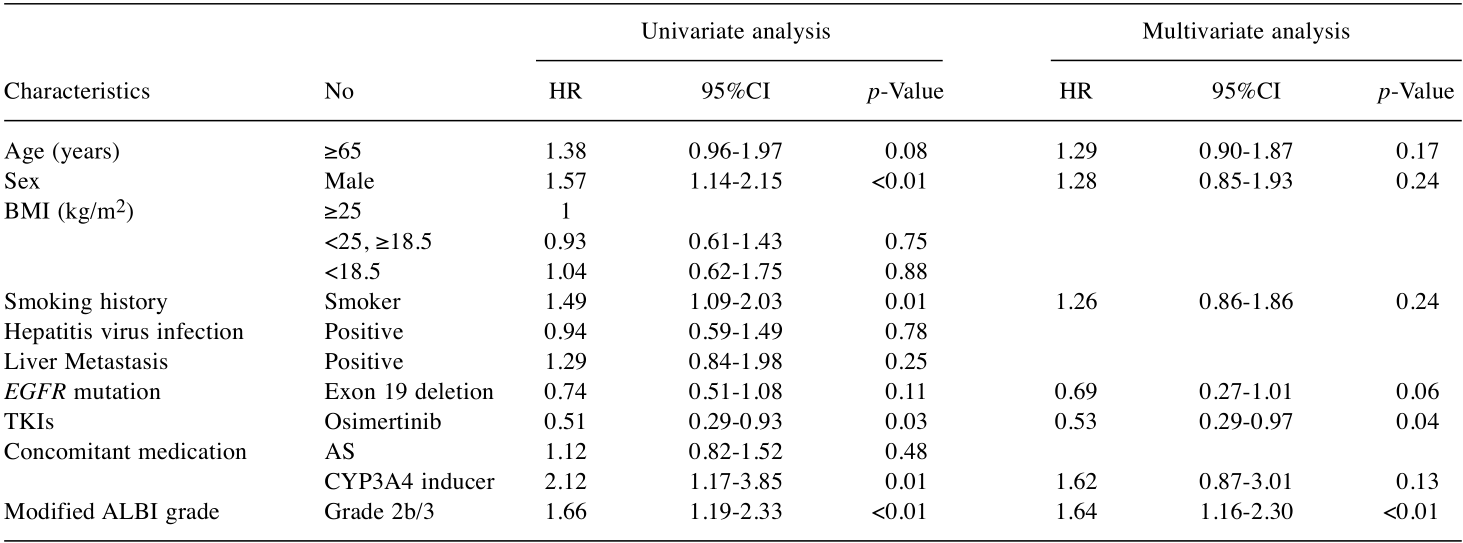 所有患者的中位TTF为8.4个月(95%CI=6.4-10.4)。Kaplan-Meier单因素分析显示,ALBI 1/2a级组中位TTF为10.6个月,显著长于2b/3级组的5.8个月(HR=1.66,95%CI=1.19-2.33,p=0.003)。单因素分析还显示,男性(p<0.01)、有吸烟史(p=0.01)、合并使用CYP3A4诱导剂(p=0.01)与TTF缩短相关。多因素分析证实,ALBI 2b/3级(HR=1.64,95%CI=1.16-2.30,p<0.01)是TTF缩短的独立预测因素,第三代EGFR-TKIs治疗(HR=0.53,95%CI=0.29-0.97,p=0.04)是TTF延长的独立预测因素。