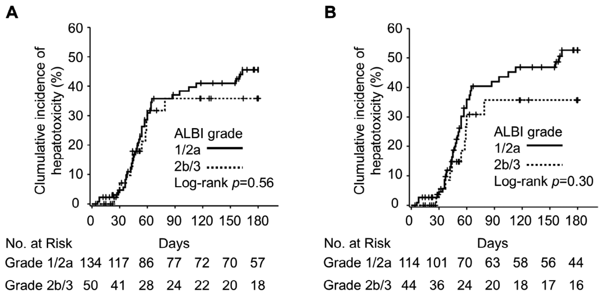 治疗开始后180天内,55例患者(29.9%)发生肝毒性,其中33例(17.9%)为3/4级肝毒性。ALBI 1/2a级组肝毒性发生率为32.1%,2b/3级组为24.0%;3/4级肝毒性发生率分别为19.4%和14.0%。Kaplan-Meier单因素分析显示,ALBI分级与肝毒性无显著相关性(log-rank p=0.56)(图1A)。