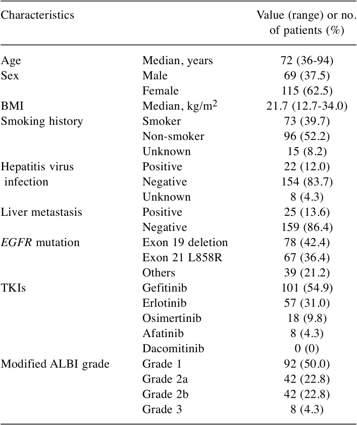 本研究最终纳入184例患者进行分析。患者中位年龄72岁(范围36-94岁),男性占37.5%,有吸烟史者占39.7%,无吸烟史者占52.2%,12.0%有肝炎病毒感染史,13.6%存在肝转移。EGFR突变类型中,外显子19缺失占42.4%,21外显子L858R突变占36.4%,其他突变占21.2%。治疗药物方面,吉非替尼占54.9%,厄洛替尼占31.0%,奥希替尼占9.8%,阿法替尼占4.3%。ALBI分级分布为1级50.0%、2a级22.8%、2b级22.8%、3级4.3%。