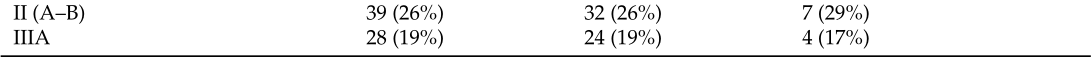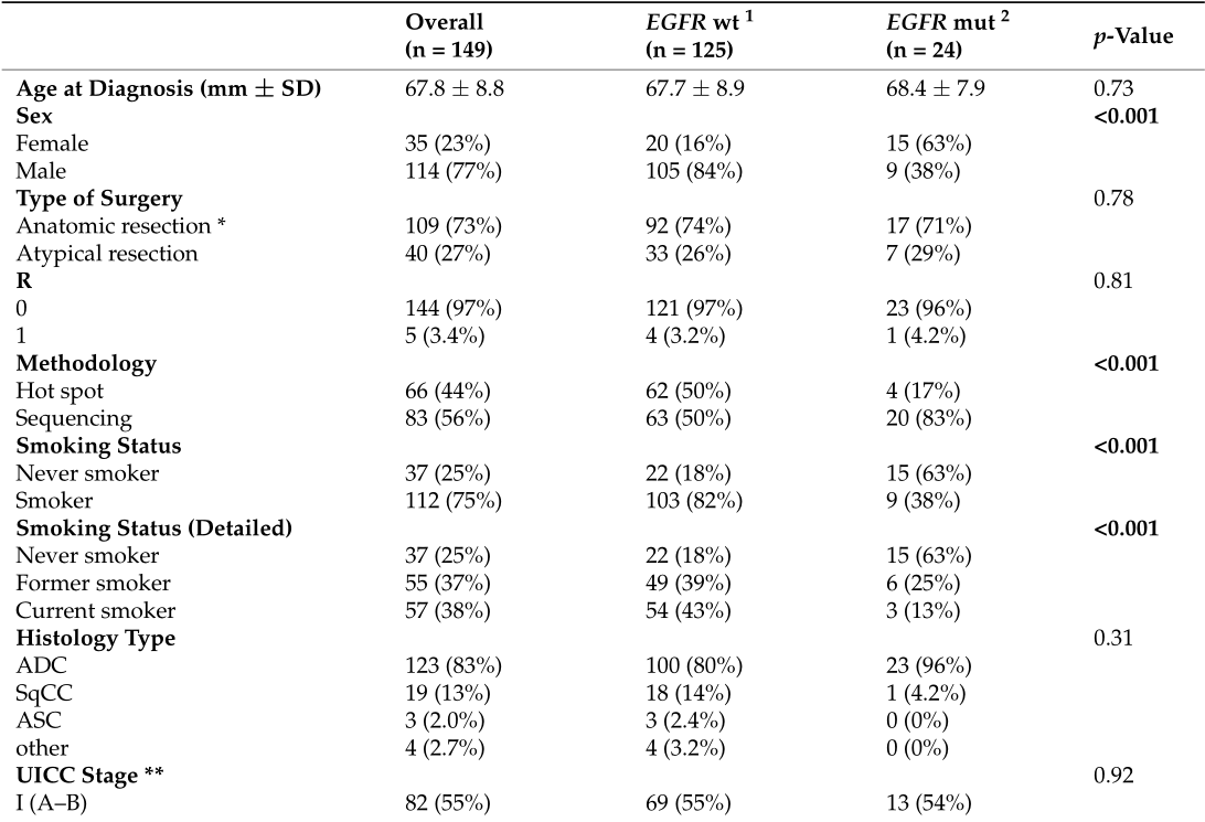 149例纳入患者中,114例(77%)为男性,平均年龄为67岁(范围40-85岁)。仅25%(37例)为从不吸烟者,37%(55例)为既往吸烟者,38%(57例)为当前吸烟者。149例NSCLC中,83例(83%)为原发性腺癌(ADC),13%(19/149)为鳞状细胞癌(SqCC),其余4.7%(7/149)为腺鳞癌(ASC)或其他较罕见的组织学类型。本研究纳入的所有患者均来自意大利南部(普利亚大区)。所有样本均检测了EGFR和KRAS突变;患者在第8版TNM分期中的分布不均匀,IIA期患者较少(4.7%),IA期和IB期(28.9%和26.2%)、IIB期(21.5%)和IIIA期(18.8%)患者较多。