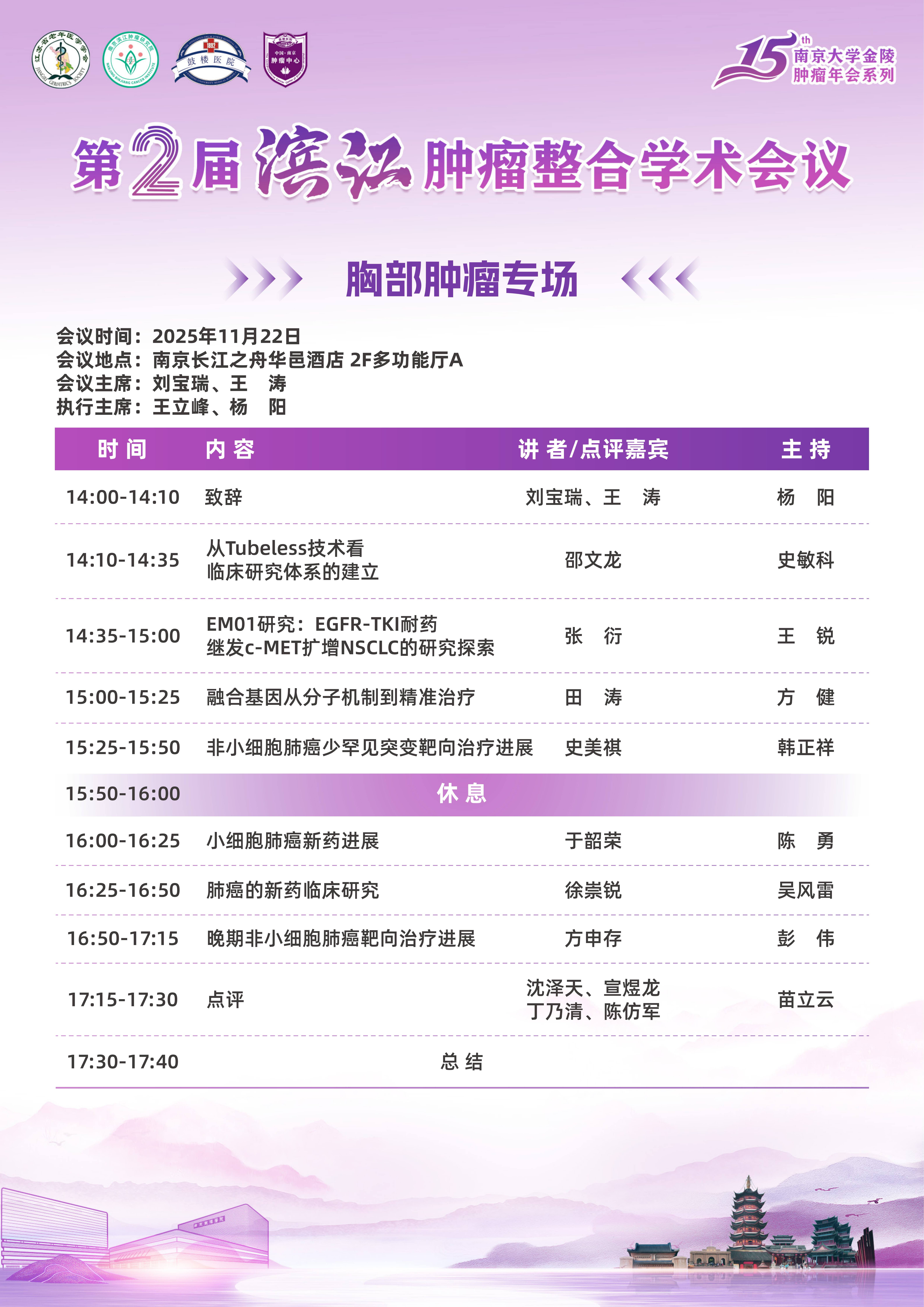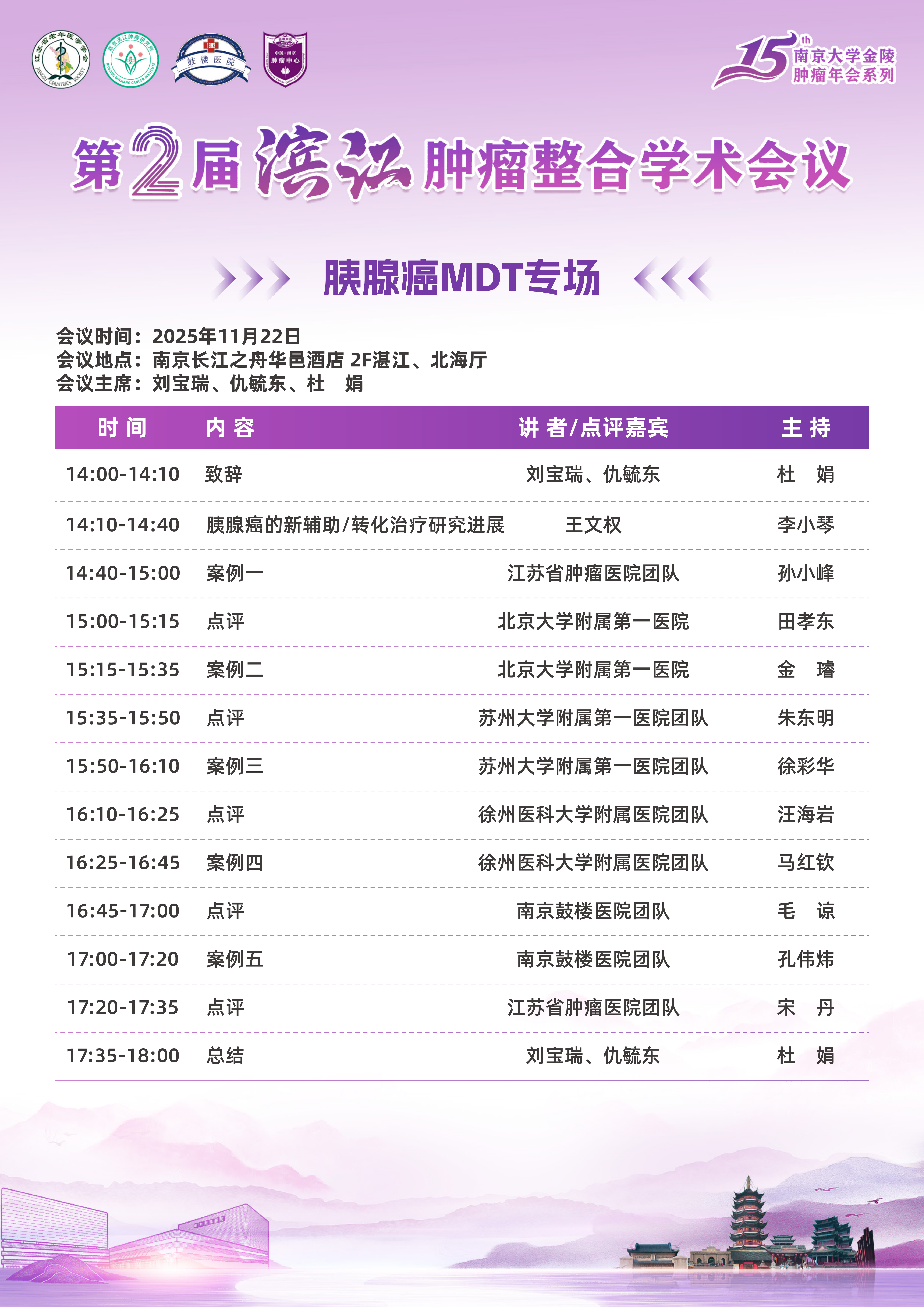 为促进肿瘤学领域的学术交流,推动肿瘤整合诊疗理念的发展与临床应用,提升我省肿瘤防治整体水平,由江苏省老年医学学会、南京滨江肿瘤研究院主办,南京大学医学院附属鼓楼医院肿瘤中心、南京大学临床肿瘤学研究所承办的“第二届滨江肿瘤整合学术会议”定于2025年11月21-23日在南京召开。本次会议将同期举办“南京大学金陵肿瘤年会”“南京市肿瘤医疗质量控制中心年会”及“难治性消化道肿瘤诊疗进展学习班”