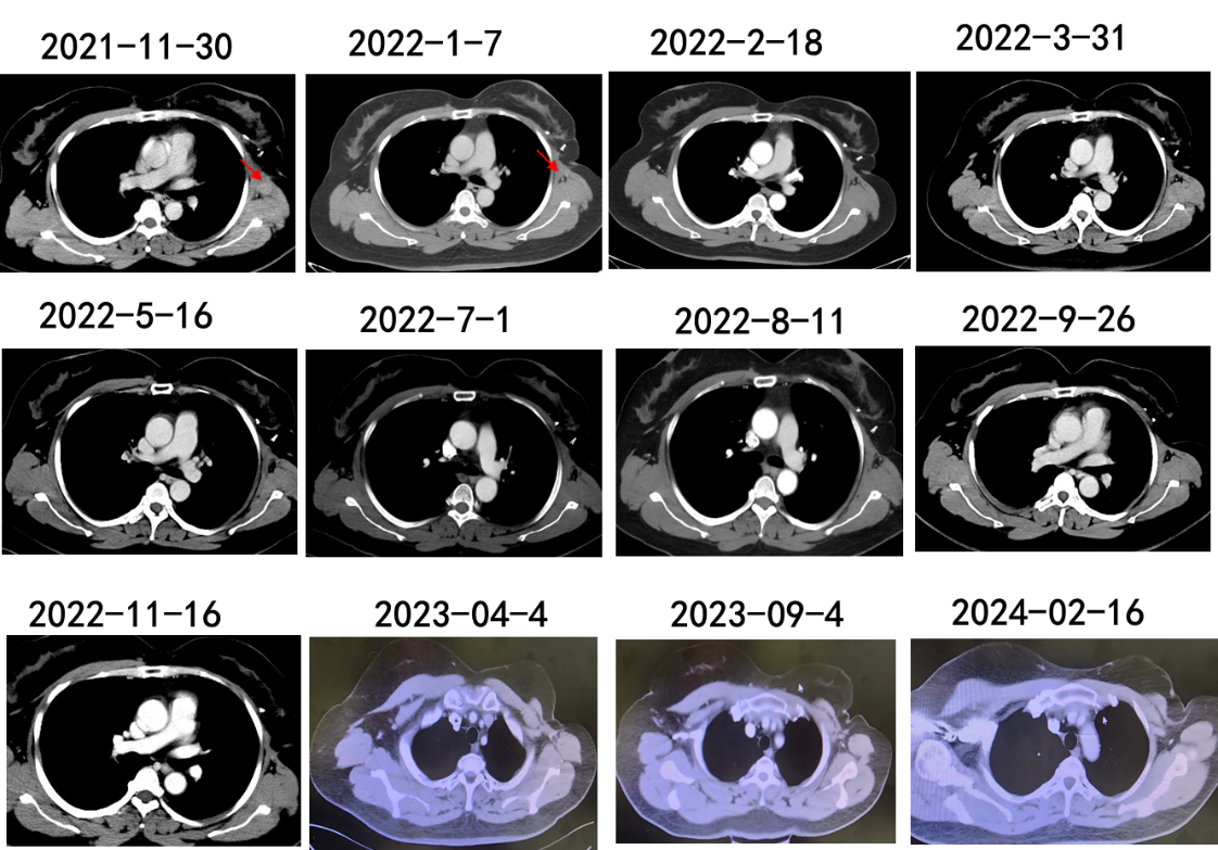 入组“PD-1单抗加安罗替尼联合节拍化疗在晚期三阴性乳腺癌中的疗效、安全性及探索性转化研究”。2021年12月1日至2023年11月24日予长春瑞滨软胶囊40mg po tiw + 安罗替尼12mg d1-14 q21d + 信迪利单抗200mg ivdrip q21d治疗;2023年11月24日起停用信迪利单抗,改为长春瑞滨软胶囊40mg po tiw + 安罗替尼12mg d1-14 q21d维持治疗至今。