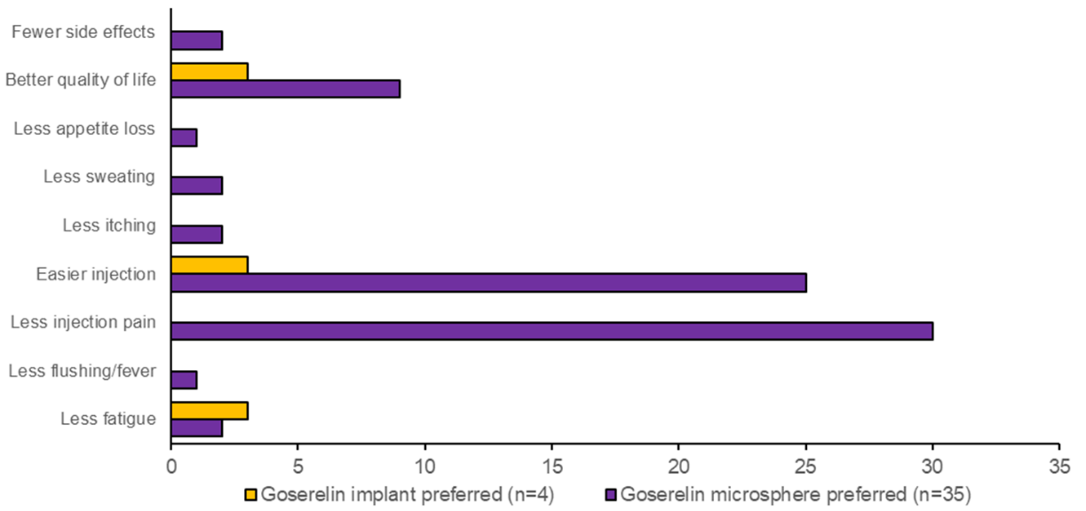 分析患者偏好选择的常见原因,发现偏好戈舍瑞林微球的原因主要是注射部位的疼痛更小和更简便的药物注射方式以及总体上更好的生活质量这3个主要因素,而偏好戈舍瑞林植入剂患者数太少,偏好原因也不一致(图3)。