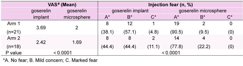 进一步分析患者对于注射戈舍瑞林微球和戈舍瑞林植入剂的即刻疼痛感(VAS评分)和患者对于针头产生的注射恐惧感,发现在即刻疼痛感(VAS)方面,戈舍瑞林微球的疼痛感(VAS评分)显著低于戈舍瑞林植入剂(P<0.0001);而在注射恐惧感方面,仅有初次注射戈舍瑞林植入剂时患者产生了“C:明显的恐惧感”(3例) ,初次注射戈舍瑞林微球的患者大部分都选择了“A:无任何恐惧感”,无论是在组1(90.5%)还是组2(77.8%),最终的分析得出,初次注射戈舍瑞林微球的恐惧感显著低于初次注射戈舍瑞林植入剂(P<0.0001)(表2)。