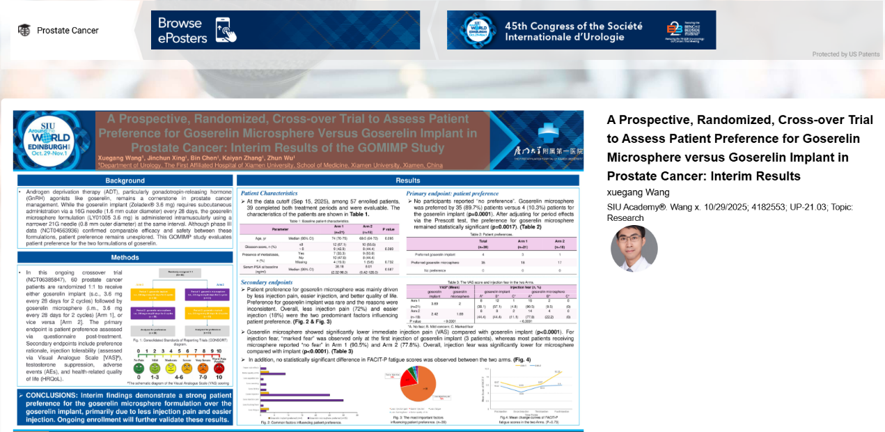 近日,在2025年国际泌尿外科学会(SIU 2025)年会上,厦门大学附属第一医院王雪刚教授团队以壁报形式发布了GOMIMP研究中期结果,题为 “A Prospective, Randomized, Cross-over Trial to Assess Patient Preference for Goserelin Microsphere Versus Goserelin Implant in Prostate Cancer: Interim Results of the GOMIMP Study”。该前瞻性、随机交叉研究共纳入57例需接受雄激素剥夺治疗(androgen deprivation therapy, ADT)的前列腺癌患者,所有受试者先后接受戈舍瑞林植入剂与戈舍瑞林微球两种剂型,并在完成两种戈舍瑞林剂型治疗后,评估患者用药选择偏好、注射疼痛、注射恐惧及相关患者报告结局(patient-reported outcomes, PROs)等指标。