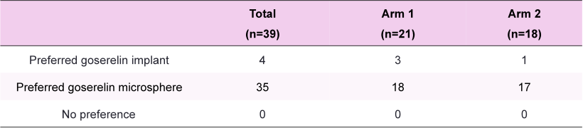39例完成“患者选择偏好”问卷的患者中,35例 (89.7%)选择了戈舍瑞林微球的偏好,4例 (10.3%)选择了戈舍瑞林植入剂的偏好(表1),两种剂型的选择具有显著统计学差异(p=0.0001),为进一步排除用药次序的交互影响,采用Prescott test方法进一步验证得到同样的结论,患者对于戈舍瑞林微球的偏好显著优于戈舍瑞林植入剂(p=0.0017)。