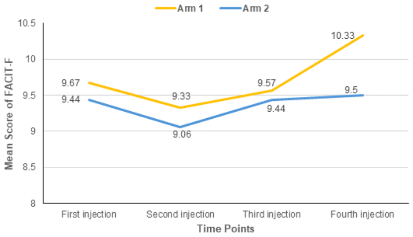 此外,基于FACIT-F量表的评估结果则显示,两组患者在治疗期间的疲劳水平变化方面未见显著差异 (图5, P=0.73)。