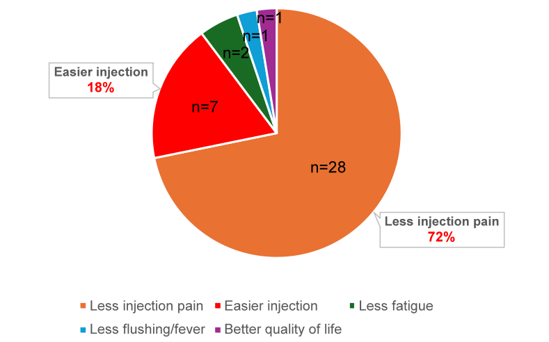 分析患者偏好选择的主要原因,其中注射部位的疼痛更小(72%)和更简便的药物注射方式(18%)是最主要的2个因素(图4)。