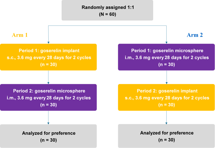 在前列腺癌ADT治疗领域,关于戈舍瑞林植入剂与戈舍瑞林缓释微球剂型之间患者偏好及注射体验的前瞻性比较证据仍是空白。既往Ⅲ期随机非劣性试验结果已表明,3.6 mg戈舍瑞林缓释微球在诱导及维持去势水平睾酮方面不劣于3.6 mg戈舍瑞林植入剂,整体安全性相当[4]。在此背景下,GOMIMP研究借鉴CABADOC、PISCES及ODENZA研究的“随机交叉+患者偏好”范式,采用前瞻性、随机交叉、开放标签设计,以患者用药选择偏好为主要终点,评估戈舍瑞林两种剂型的主观偏好度和偏好原因,旨在在疗效与安全性相近的前提下,为 ADT剂型决策时系统性考虑“以患者为中心”的患者偏好提供循证支持。