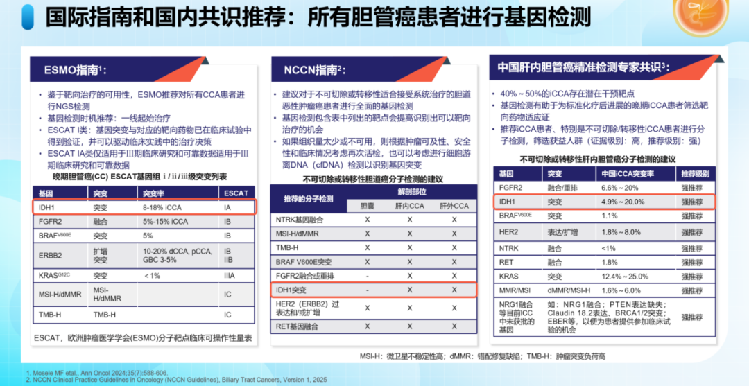 李达教授:胆管癌具有显著的基因异质性。近年来,随着基因检测技术的快速发展,我们对胆道恶性肿瘤的分子复杂性有了更为深入的认识。研究显示,高达40%的胆管癌患者具有可靶向的基因突变1,其中,IDH1突变在肝内胆管癌的发生率约为6.5%~20%2ESMO、NCCN、CSCO等权威指南均推荐胆管癌患者进行基因检测(IDH1的推荐等级为1A)3-5