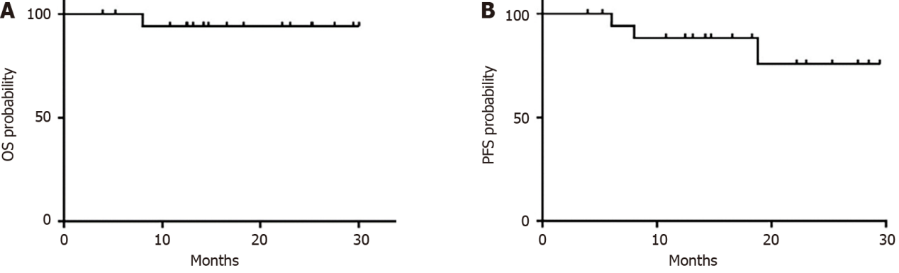 生存结局方面,2年PFS率和OS率分别为75.6%和94.1%,中位PFS和中位OS均未达到(图2)。在接受ASCT巩固治疗的9例患者中,ORR为88.9%;在接受泽布替尼维持治疗的10例患者中,ORR为80%。