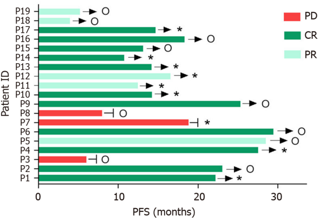 中位随访14.7个月的研究结果显示,整体患者的ORR高达84.2%(16/19),其中11例(57.9%)患者达到完全缓解(CR),5例(26.3%)患者达到部分缓解(PR)(图1)。