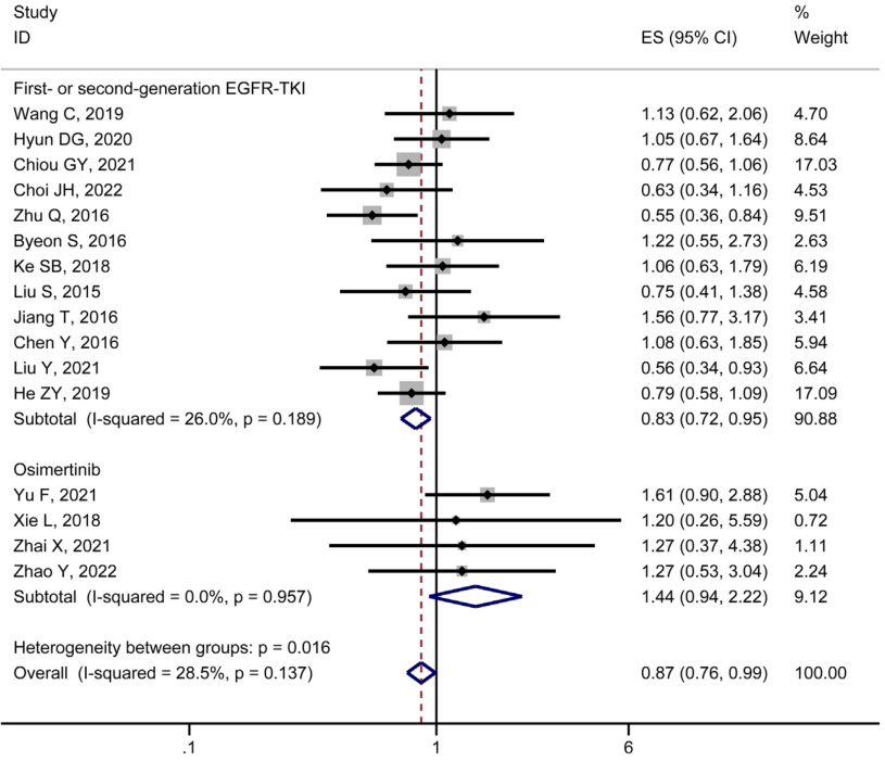 16篇文献提供OS的HR值,异质性检验显示I²=28.5%,P=0.137,异质性较低,采用固定效应模型分析。结果显示,早期脑部放疗联合EGFR-TKI在改善OS方面显著优于单纯EGFR-TKI(HR=0.87,95%CI:0.76-0.99)(图1)。