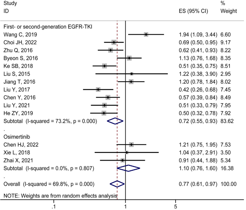 图1 森林图显示早期脑放疗联合EGFR-TKI与单纯EGFR-TKI治疗相比,总生存期(OS)的合并风险比(HR)。