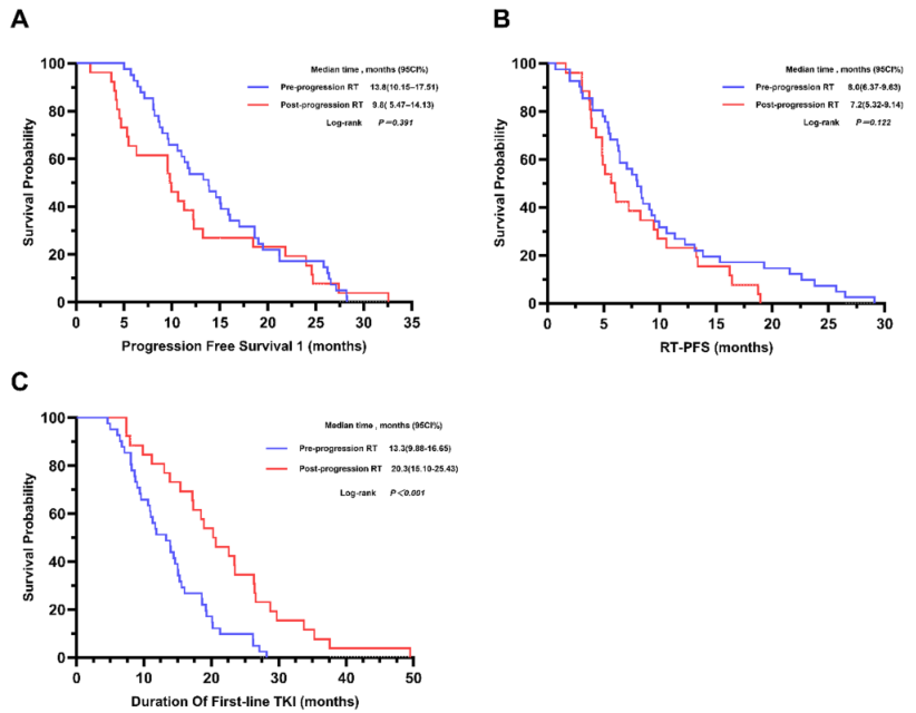 图1 (A)无进展生存期1,(B)放疗后天数,以及(C)进展前和进展后放疗组患者一线TKI治疗持续时间