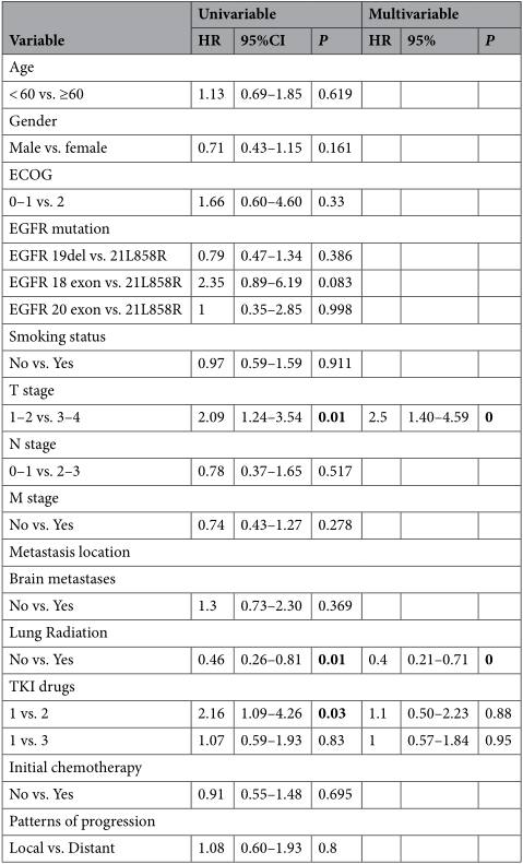 单变量Cox回归分析显示,与TKI持续时间延长相关的因素包括原发灶放疗(HR=0.465,95%CI:0.26-0.81,p=0.008)、较低T分期(T1-2 vs T3-4,HR=2.09,95%CI:1.24-3.54,p=0.006)和一代TKI使用(1代vs 2代,HR=2.16,95%CI:1.09-4.26,p=0.027)。多变量Cox回归分析证实,原发灶放疗(HR=0.39,95%CI:0.21-0.71,p=0.002)和较低T分期(HR=2.53,95%CI:1.40-4.59,p=0.002)是TKI持续时间延长的独立相关因素(表1)。
