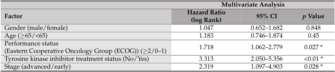 多变量Cox回归分析显示,体能状态(ECOG≥2)、未接受TKI治疗和晚期诊断是OS较差的独立预测因素。ECOG体能状态≥2的患者死亡风险是0-1级患者的1.72倍(HR=1.718,95%CI:1.062-2.779,p=0.027);未接受TKI治疗的患者死亡风险显著升高(HR=3.313,95%CI:2.050-5.356,p<0.01);晚期患者的死亡风险是早期患者的2.3倍(HR=2.319,95%CI:1.097-4.903,p=0.028);性别和年龄与生存无显著相关性(表2)。