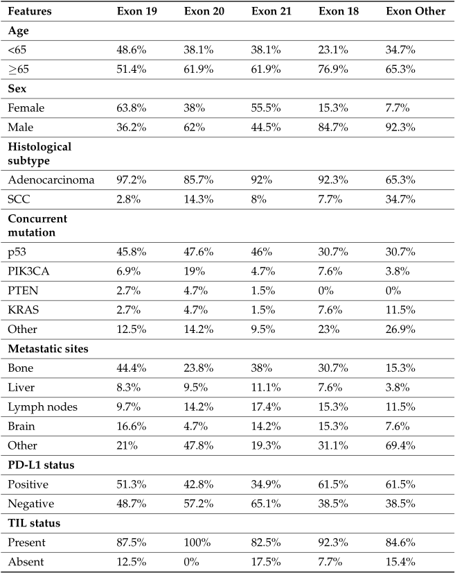 EGFR突变亚型中,19号外显子缺失最常见(40.9%,72/176),其次为21号外显子点突变(35.8%,63/176),其他少见突变(包括18号外显子突变、20号外显子插入和点突变、2号外显子和7号外显子等区域改变)占23.3%(41/176)。19号外显子突变与高龄(p=0.033)、女性(p=0.001)、腺癌(p=0.003)和骨转移(p=0.016)显著相关;18号外显子突变及其他号外显子突变在男性患者中更常见(p=0.014和p<0.001)(表1)。