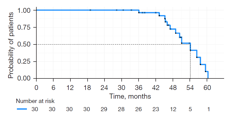 本研究共纳入30例患者,其中女性22例(73%),中位年龄55岁。97%的患者有吸烟史(平均1.6包/年,标准差±0.34包/年),仅1例为终生不吸烟者。诊断时27例(90%)已存在CNS转移,另有3例在疾病进展中出现脑转移。脑转移灶中位数为2个(范围:1–3个)。患者基线特征详见表1。