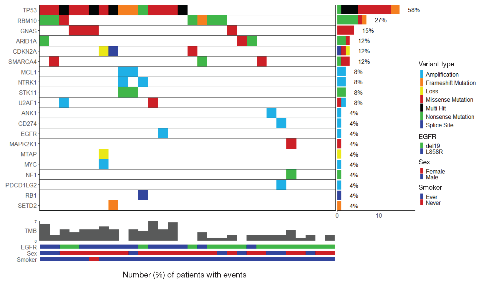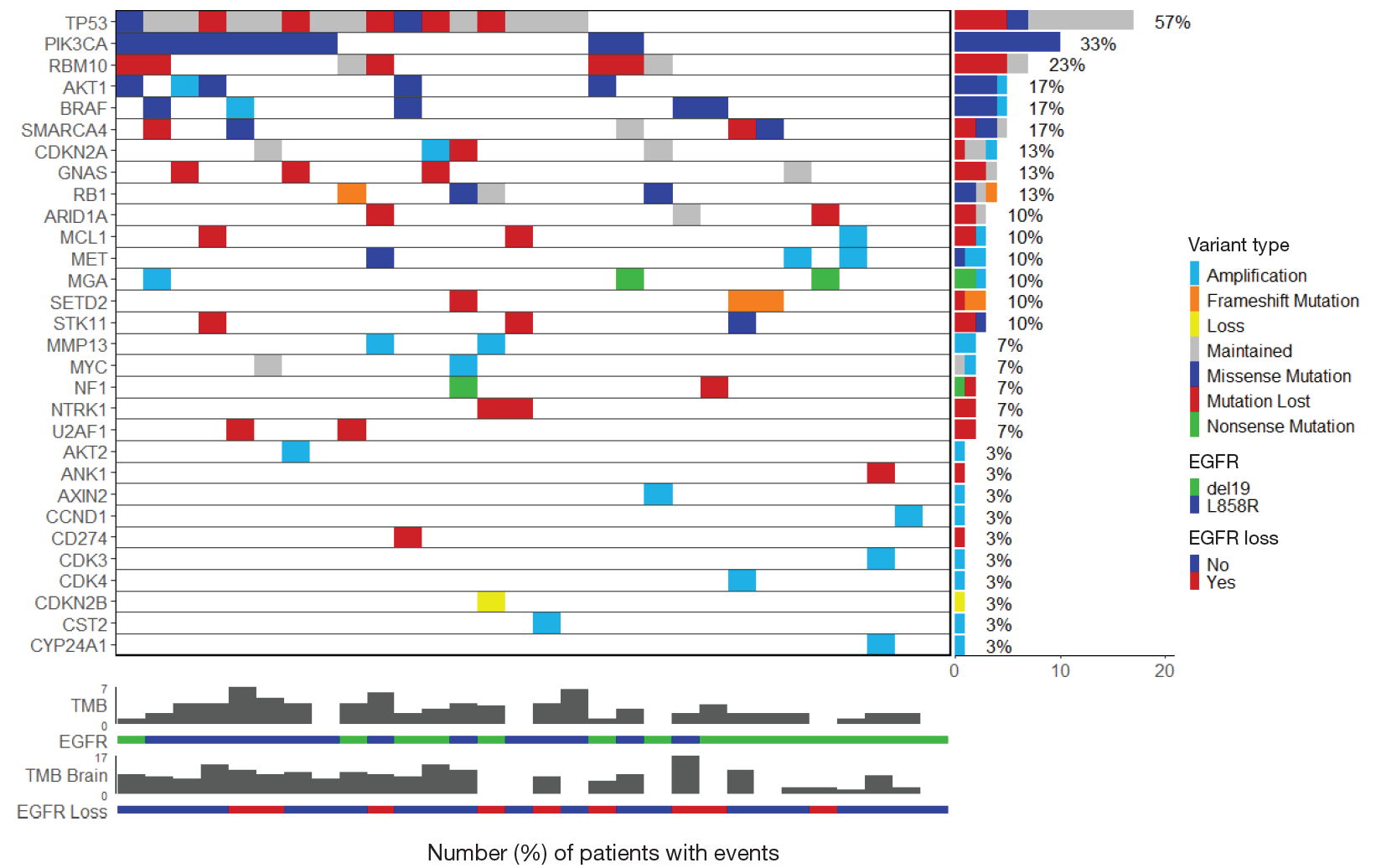配对分子分析揭示了原发性肺肿瘤和脑转移瘤之间存在显著差异。基因组谱分析显示,14例患者(47%)存在19号外显子缺失,其余患者存在L858R突变。TP53是原发病灶中最常见的共突变基因,见于16例(53.3%),其次是RBM10突变,见于23%的患者中(7例),其中3例与TP53突变同时发生。其他值得注意的改变包括STK11(n=2,7%)、GNAS(n=4,13%)和RB1(n=1,3%)的突变。原发病灶的平均肿瘤突变负荷(TMB)为3.2 mut/Mb。原发肿瘤中的突变共存情况如图1所示。