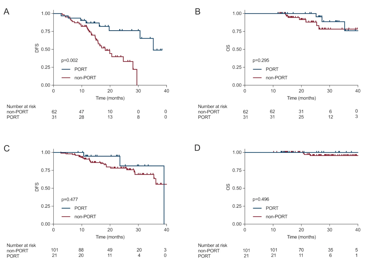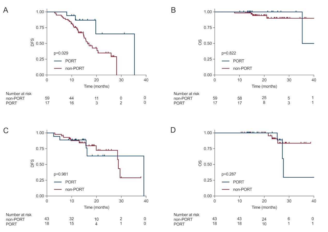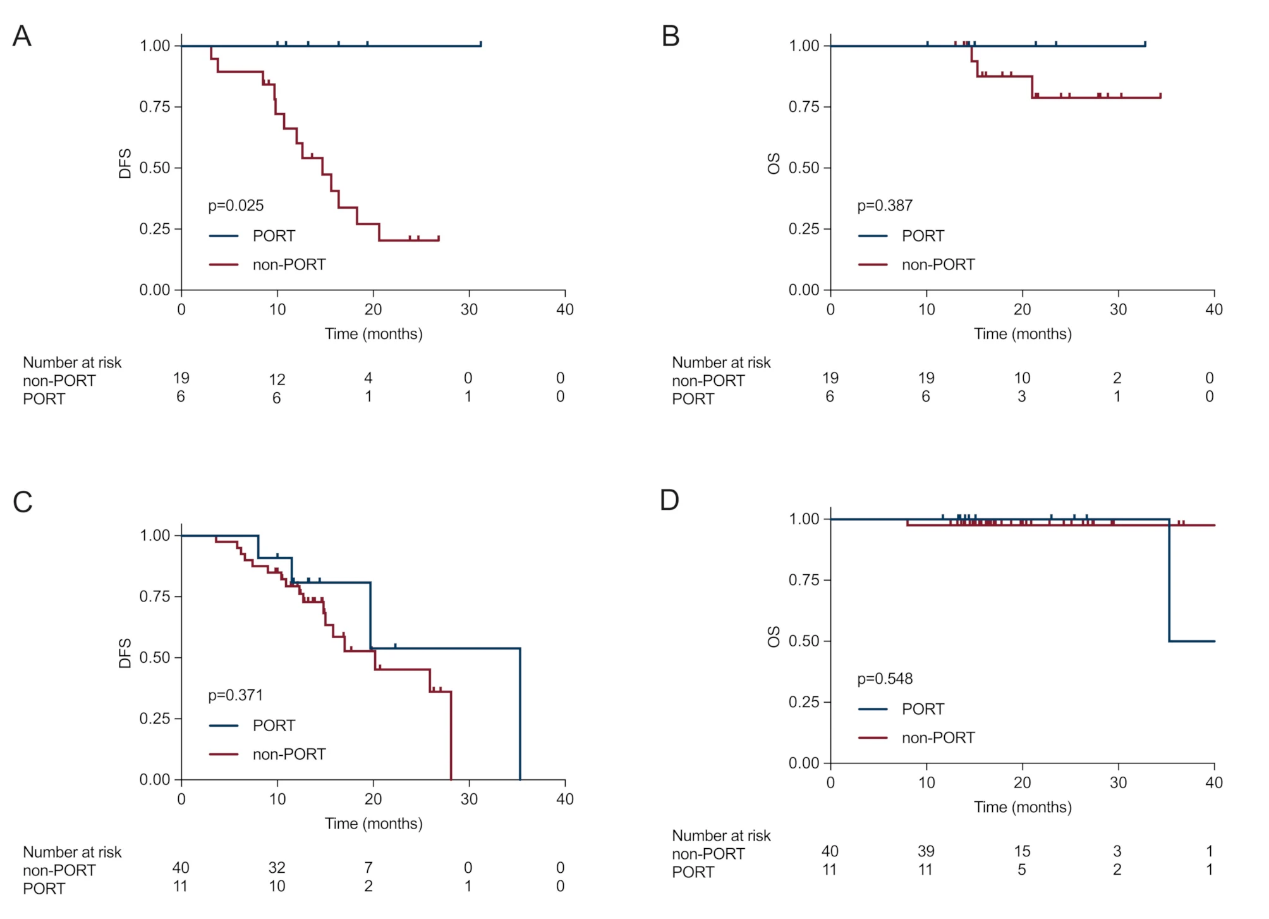 在PD-L1阳性患者中,进一步的探索性分析显示,在接受辅助免疫治疗的患者中,PORT组的DFS长于非PORT组(中位DFS:NA vs 14.7个月,p=0.025)。然而,两组患者的OS无显著差异(p=0.387)。在未接受辅助免疫治疗的患者中,DFS和OS在PORT组和非PORT组之间均未显示出显著差异(分别为p=0.371;p=0.548)(图4)。