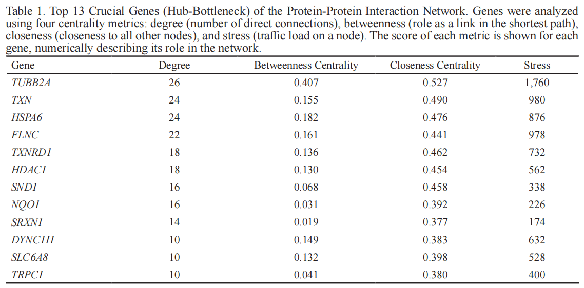 研究使用Network Analyzer和CytoHubba插件来分析网络。基于四个关键的中心性指标(度、介数、紧密度和压力)对节点进行排名。关键基因(Hub-bottleneck genes)由度排名前20的枢纽基因和介数排名前20的瓶颈基因的重叠确定。