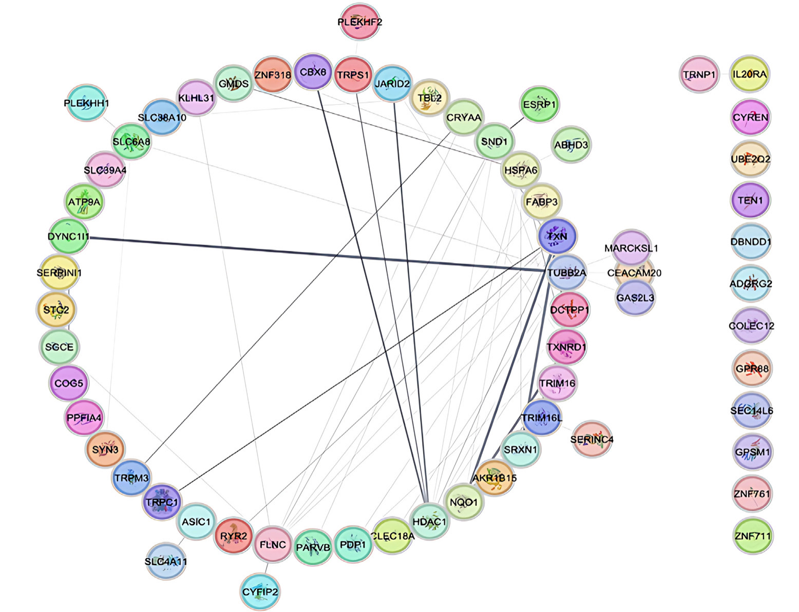 通过CytoHubba和Network Analyzer分析,共确定了13个关键基因(Hub-bottleneck基因)。其中,TUBB2A具有最高的度评分(26),表明其在网络中连接最紧密。