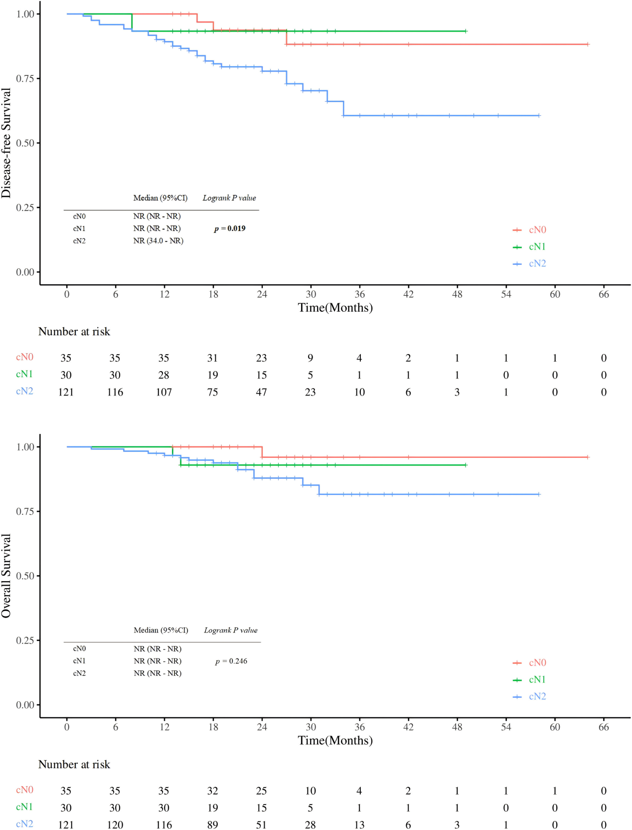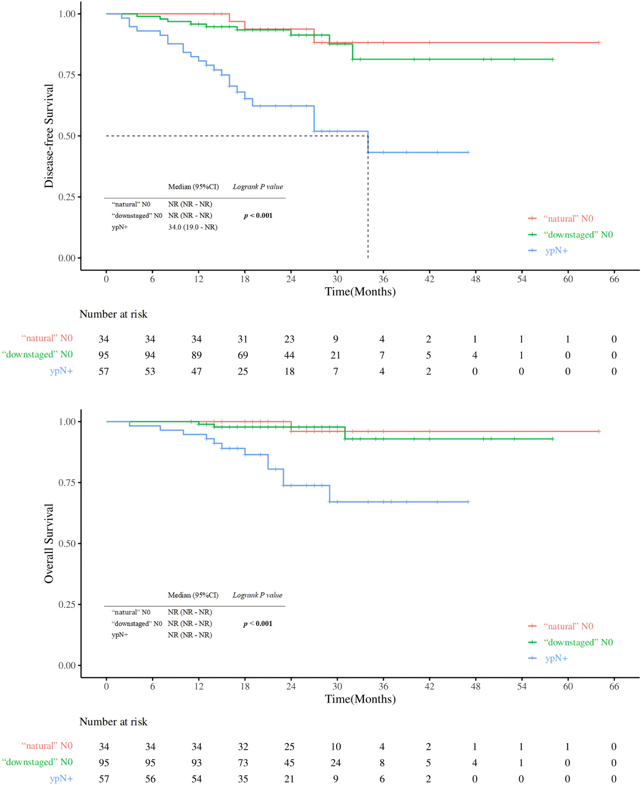 图2 DFS和OS的KM曲线:“自然”N0、“降期”N0 和 ypN+ 之间的比较