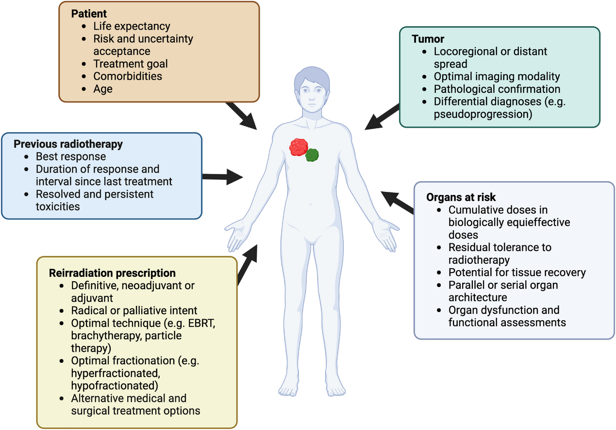 reRT可用于根治性或姑息性治疗。根治性再程放疗:reRT可作为肿瘤切除术后的确定性治疗或术后的辅助治疗。全身治疗通常会同时或序贯加入,以增强疗效。确定性reRT适用于肉眼可见肿瘤的治疗,尤其是在无法进行手术的情况下,可能实现长期的疾病控制乃至根治。术后辅助再程放疗:在具有不良预后因素(例如近手术切缘或阳性)的患者中,需要进行术后reRT。姑息性治疗:reRT主要用于缓解疼痛、出血或神经功能障碍等症状,通常涉及较低剂量或较短疗程的放疗,优先考虑快速缓解症状,同时最大限度地减少急性副作用。根据患者的总体状况和更广泛的治疗策略,将全身治疗与姑息性reRT相结合,可以改善症状管理并减缓经过筛选患者的疾病进展。在进行reRT之前需要考虑的关键因素包括了解局部复发的原因。在这些因素之间取得平衡对于优化治疗效果同时最大限度地降低严重毒副作用的风险至关重要。