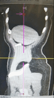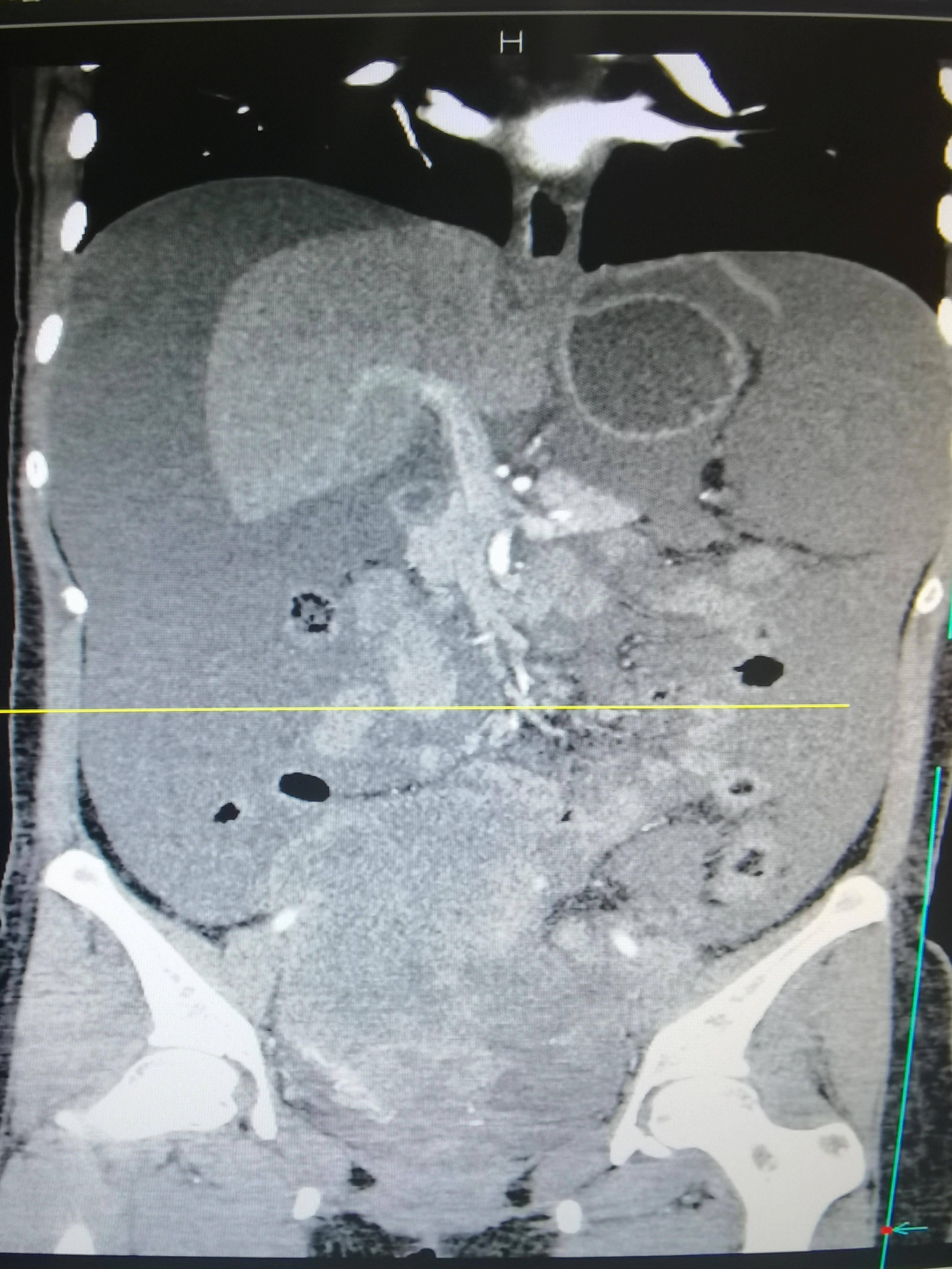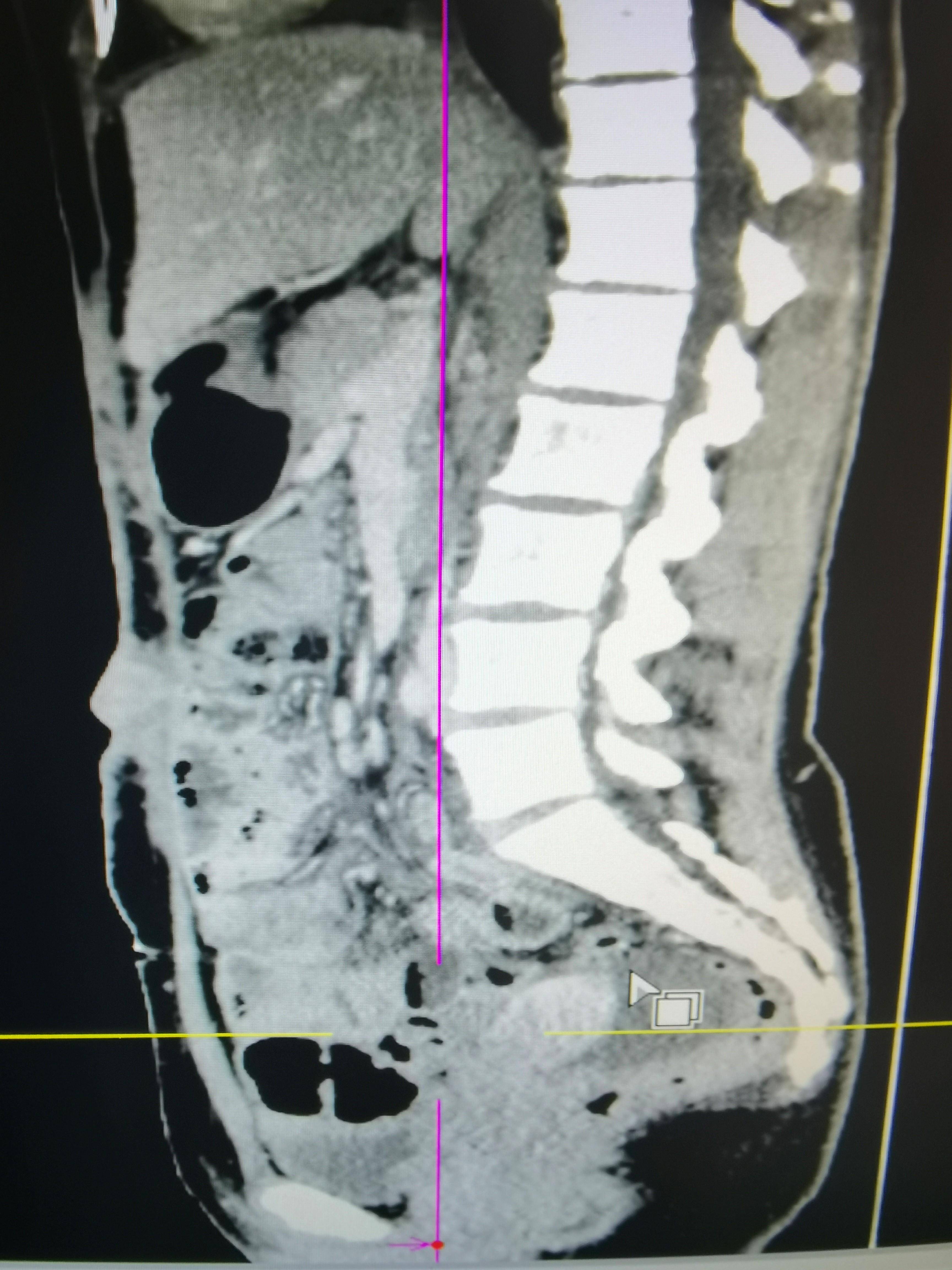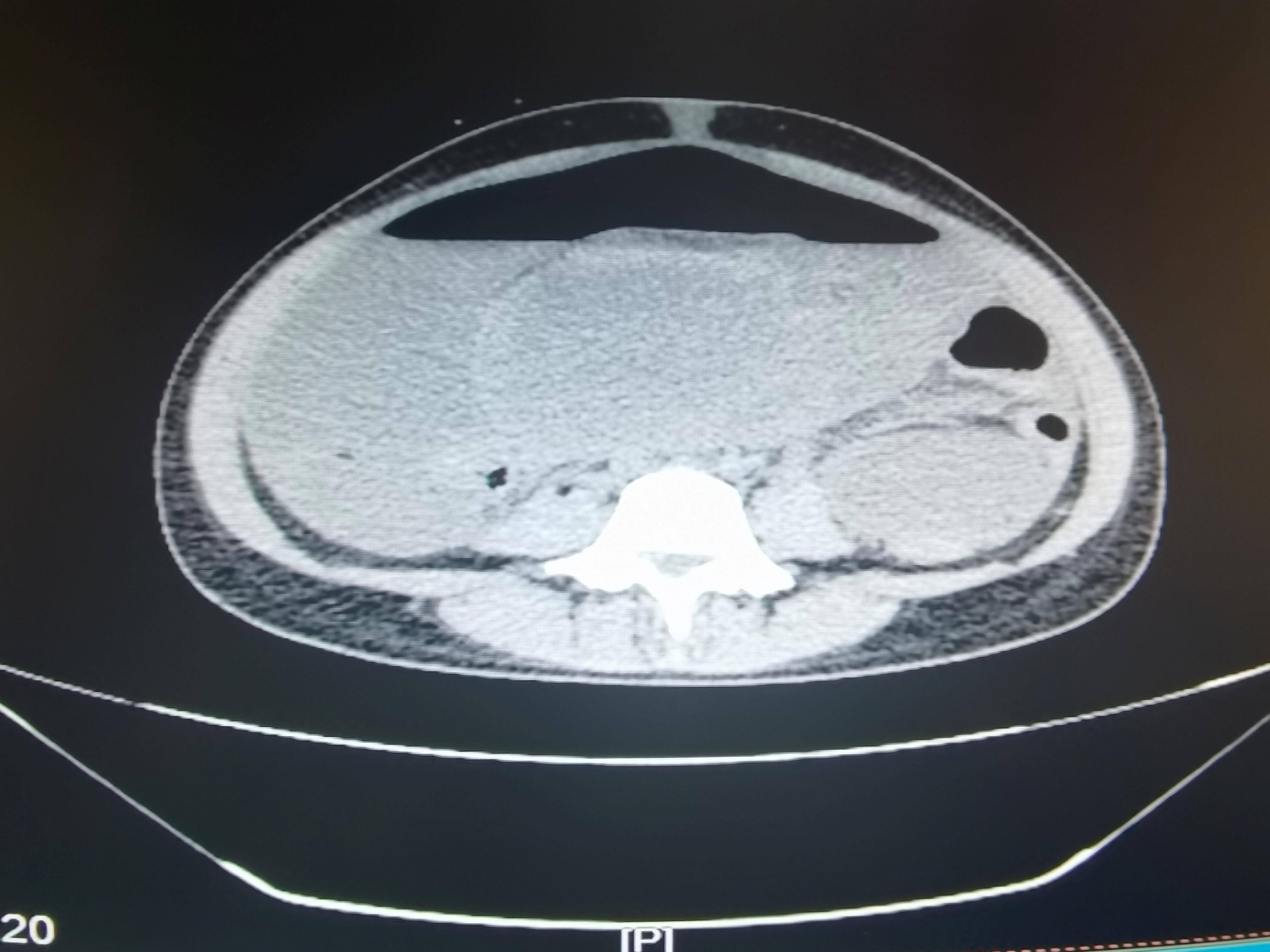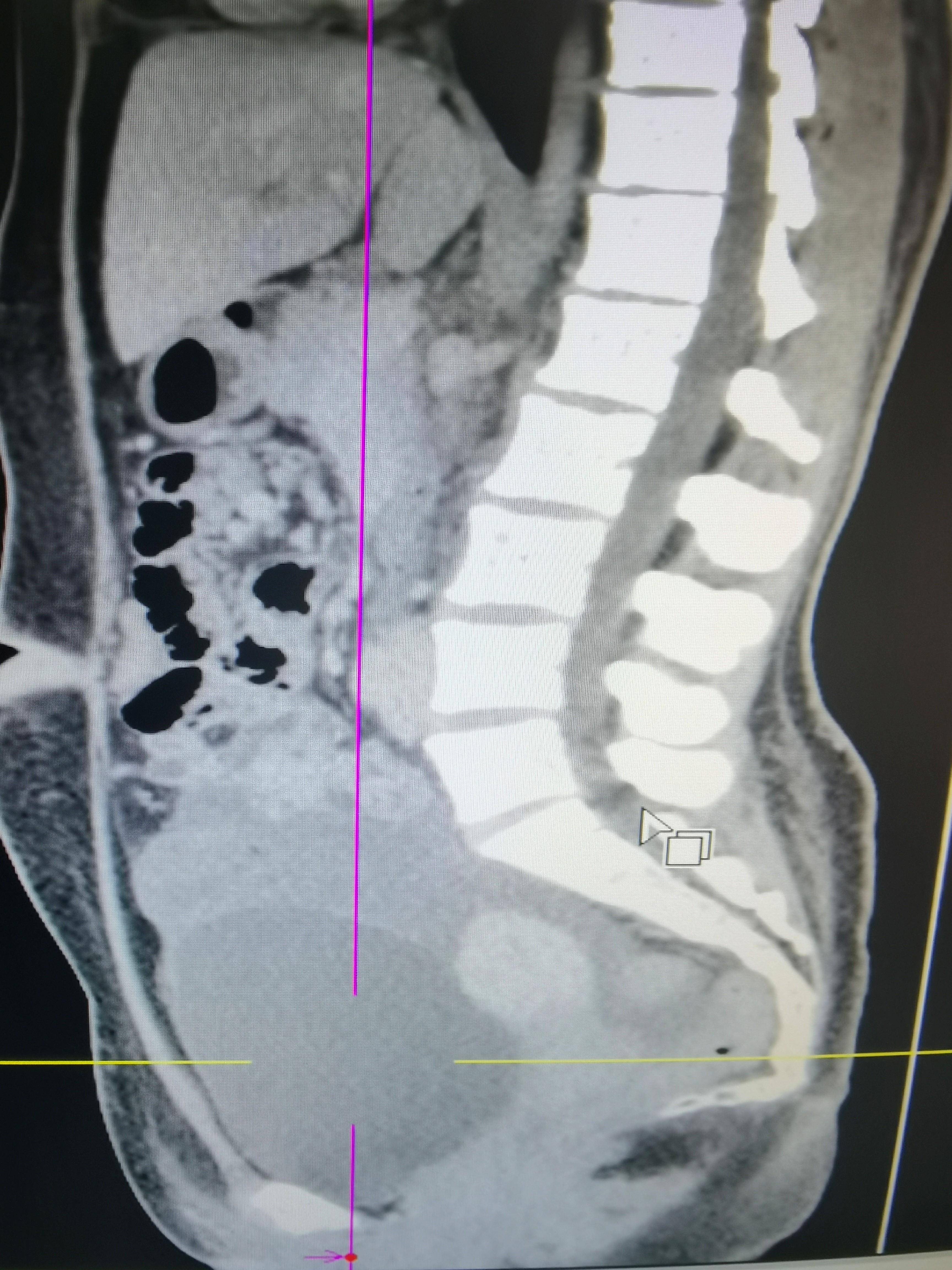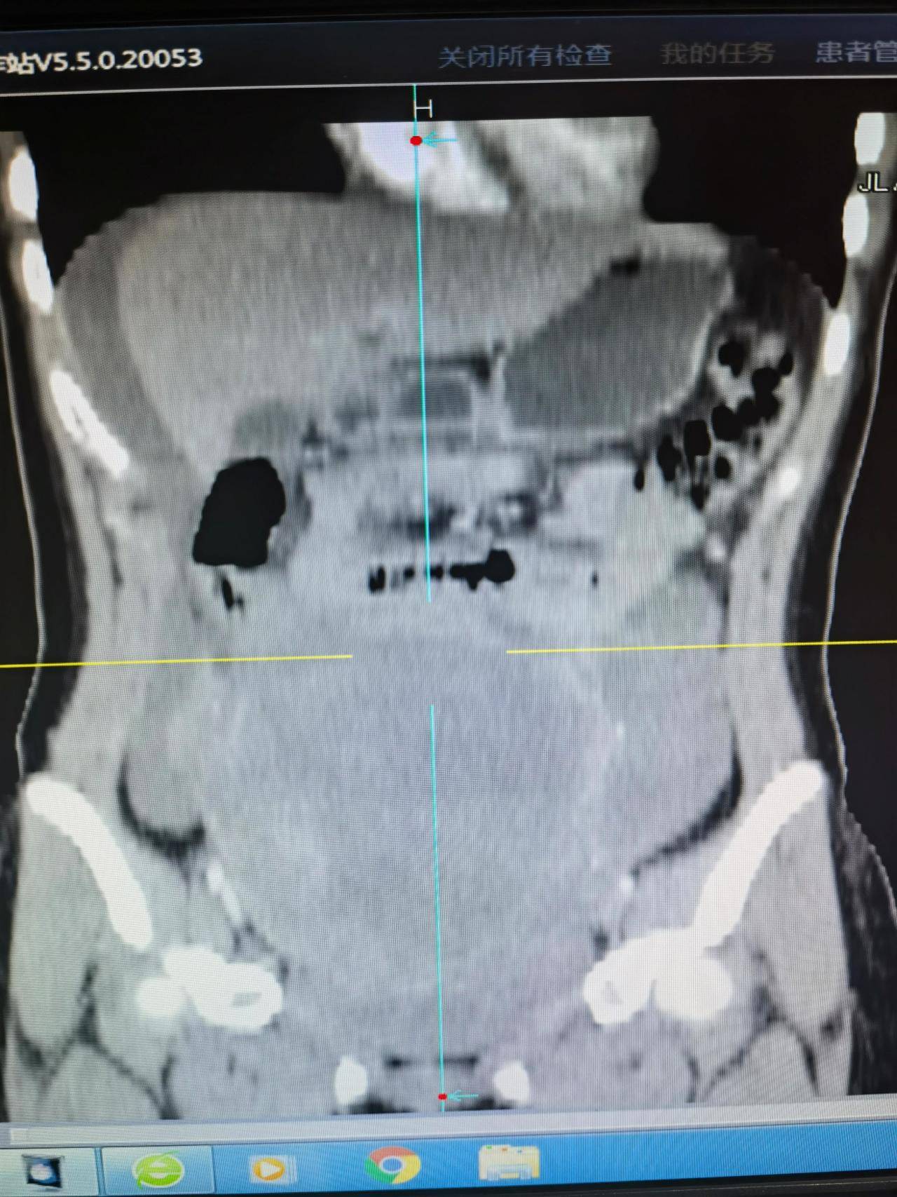◈ 2020年4月27日,行腹部CT检查提示:下腹及盆腔内可见巨大囊实性肿物,边界不清,较大层面长径约为20.9cm×8.3cm,病灶与子宫、膀胱、邻近肠管分界不清,较前范围减小。双侧附件显示不清。