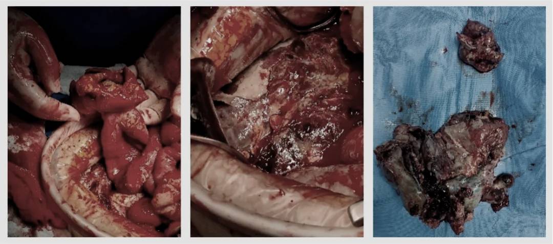 ◈ 2022年8月26日,患者突发腹部疼痛。急诊行腹部CT检查提示:盆腔见较大不规则形混杂密度影,与双侧附件及邻近肠管、右侧髂血管分界不清,最大层面约13.4cm×11.8cm,其内密度不均,可见片状高密度影及钙化密度影,病变周围似见稍高密度包膜影。左上腹部小肠旁见肿块影,与局部肠管分界不清,局部肠管走行紊乱,管壁似欠连续,腹腔内见较多液体密度影及游离气体密度影。网膜略增厚。