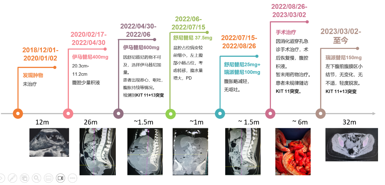 四线舒尼替尼联合瑞派替尼 (2022.7.15~2022.8.26, 约1.5个月),后因消化道穿孔行急诊手术