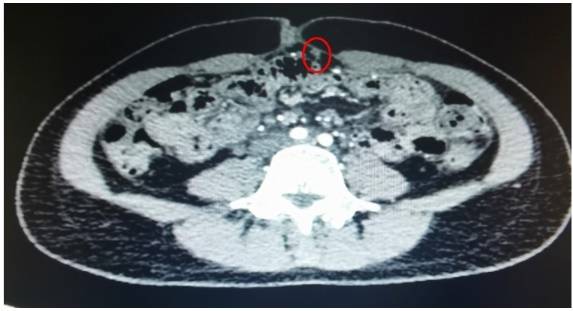 ◈ 2023年3月2日,患者来院复查腹部CT提示:中腹部小肠局部见缝合线影,吻合口未见异常强化影,盆腔内见液体密度影。腹腔脂肪间隙稍浑浊,网膜稍增厚。腹壁见瘢痕影。左下腹前腹膜区见小结节影,大小约0.6cm×0.8cm,轻度强化。