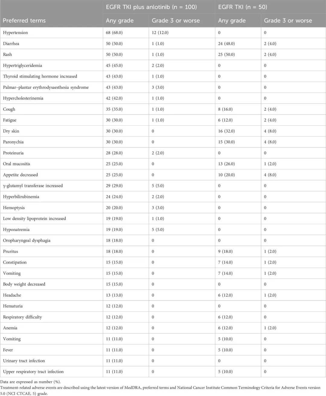 EGFR-TKIs联合安罗替尼组与EGFR-TKIs组任何级别的治疗相关不良事件(TRAEs)发生率一致为92%,EGFR-TKIs联合安罗替尼组有37例患者(37.0%)发生≥3级TRAEs,EGFR-TKIs组有16例患者(34.0%)。EGFR-TKIs联合安罗替尼组中,最常报告的≥3级TRAEs包括高血压(12.0%)、γ-谷氨酰转移酶升高(5.0%)和低钠血症(5.0%);而EGFR-TKIs组中,皮肤干燥、甲沟炎和食欲下降的发生率均为8.0%。EGFR-TKIs联合安罗替尼组有12例(12.0%)患者发生严重不良事件(SAEs),EGFR-TKIs组有6例(12.0%)患者发生SAEs。EGFR-TKIs联合安罗替尼组有23例(23.0%)患者因TRAEs导致剂量减少,EGFR-TKIs组有4例(8.0%)患者因TRAEs导致剂量减少。EGFR-TKIs联合安罗替尼组中有25例患者(25.0%)因TRAEs导致治疗中断,EGFR-TKIs组中有10例(20.0%),详见表2。