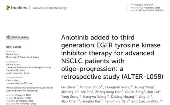 [1] Zhou F, Zhuo M, Wang H, Yang N, Li J, Jin S, et al. Anlotinib added to third generation EGFR tyrosine kinase inhibitor therapy for advanced NSCLC patients with oligoprogression: a retrospective study (ALTERL058). Front Pharmacol. 2025;16:1686364. doi:10.3389/fphar.2025.1686364.